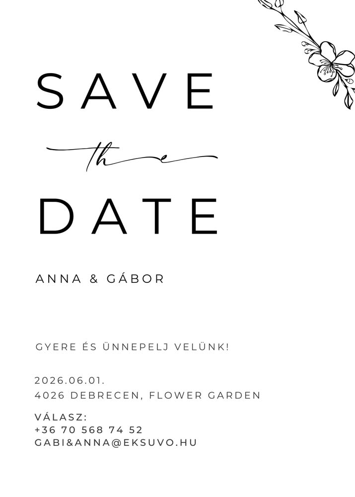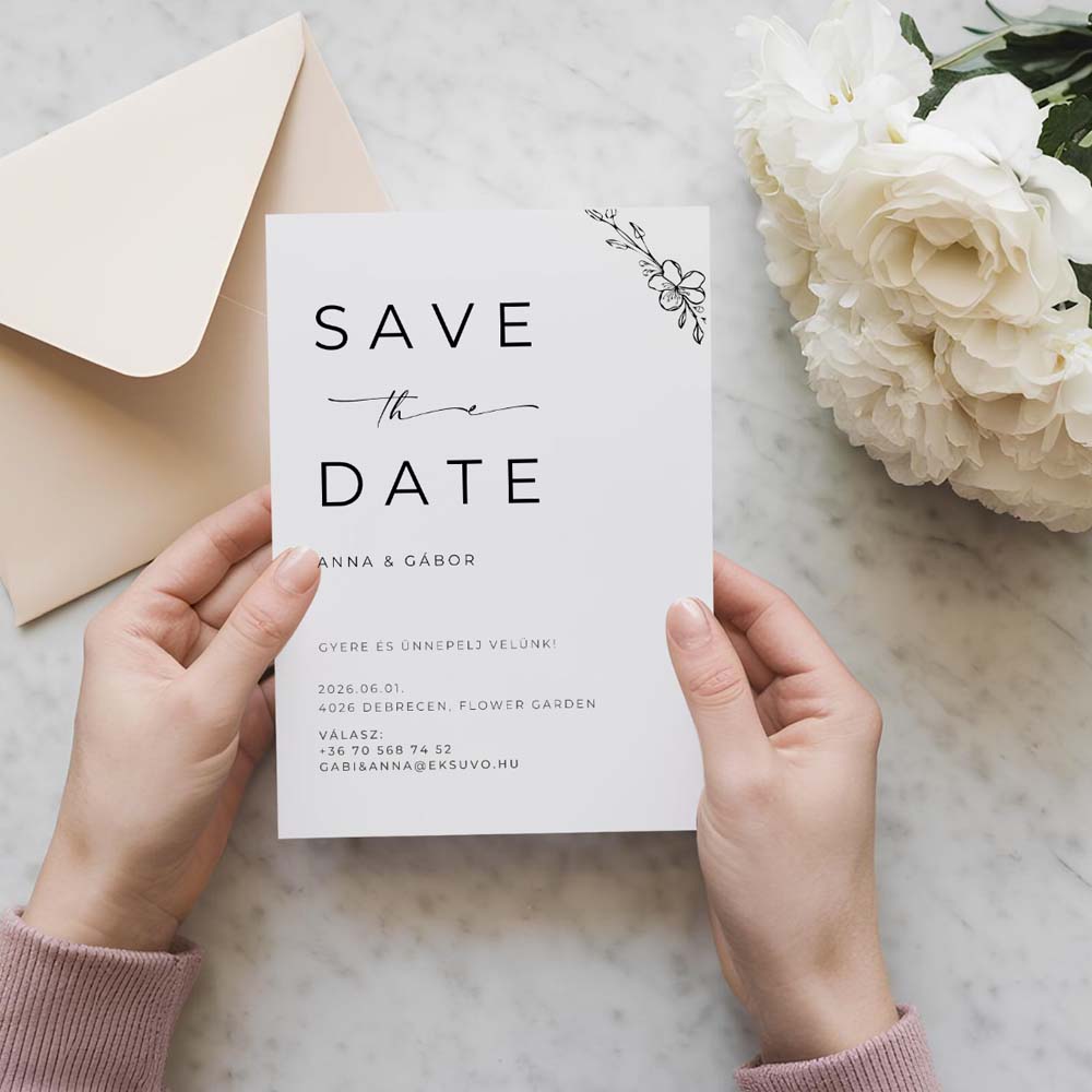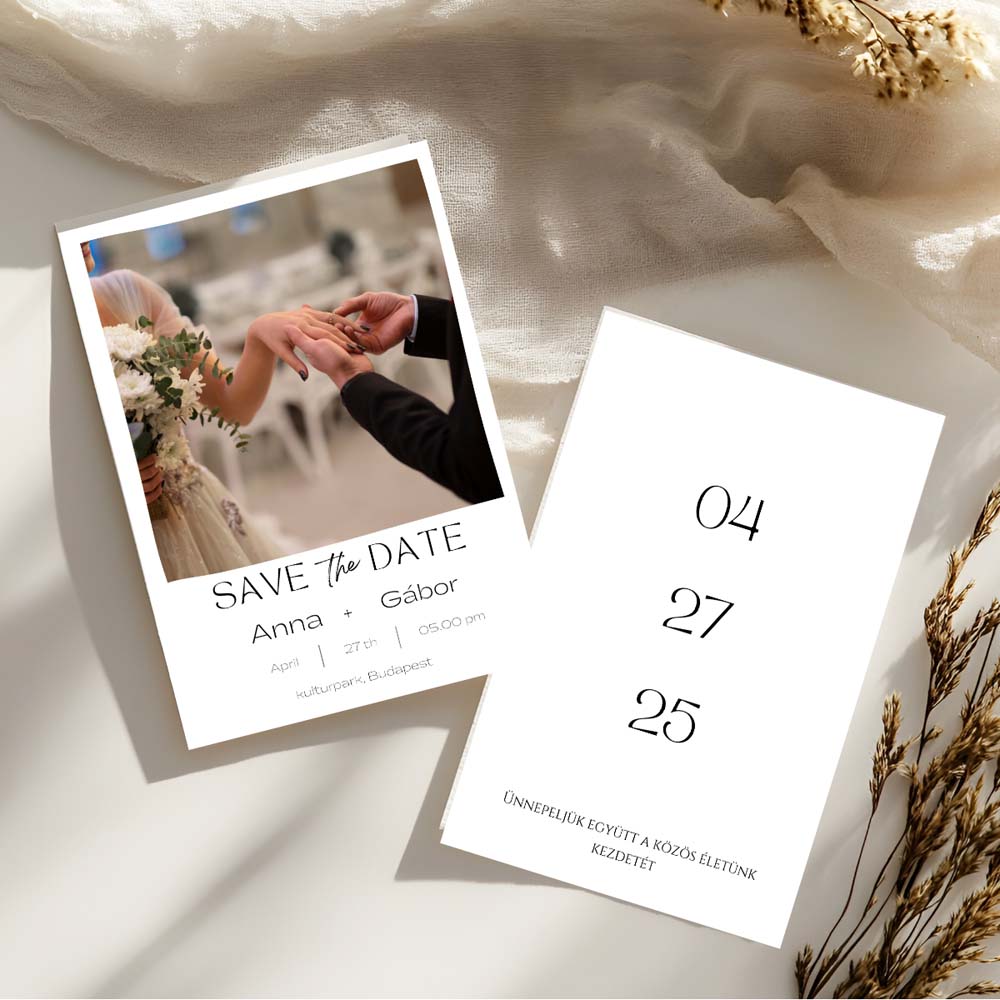 Kiváló minőségű papírból készült, modern megjelenéssel és letisztult dizájnnal. A kártya előlapján egy közös fotótok és az esküvőtök dátuma kap helyet, a hátoldalon pedig egy elegáns emlékeztető az ünnepi alkalomról. Tökéletes választás azoknak a pároknak, akik a természetes eleganciát és a személyességet keresik.