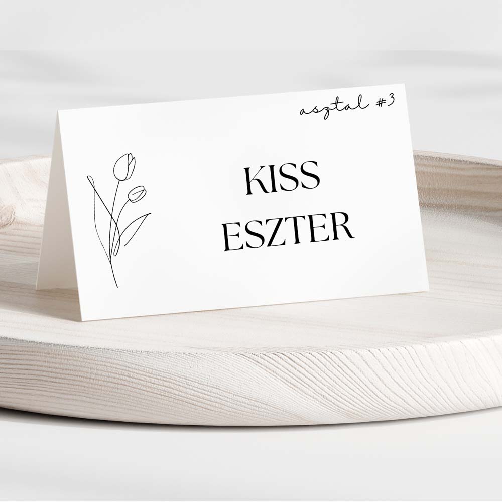 Ez a hajtogatott ültetőkártya a letisztult, skandináv stílusú design kedvelőinek készült. A minimalista, egyvonalas rajzolt virágmotívum eleganciát és lágyságot visz az asztal dekorációjába, miközben a vendég neve jól olvasható, karakteres betűtípussal szerepel.